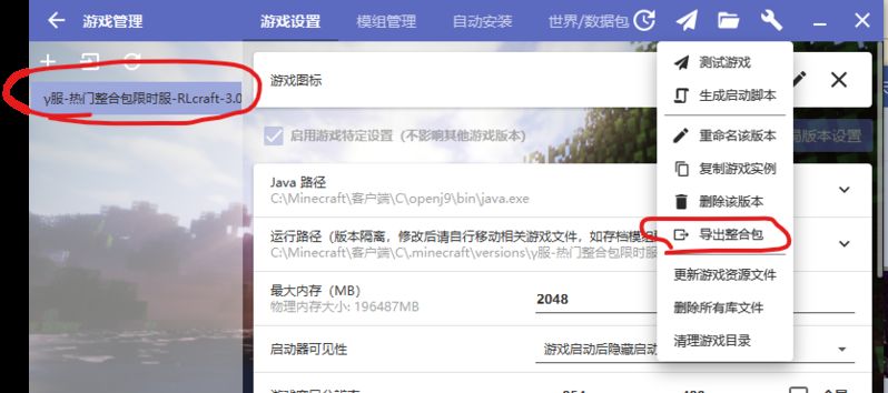 • 选择你的游戏版本,点击导出整合包